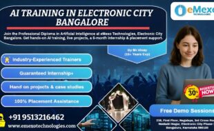 eMexo Technologies is a leading AI Training Institute in Electronic City Bangalore, offering hands-on and industry-focused Artificial Intelligence training. Our AI Course in Electronic City Bangalore covers essential AI concepts including Machine Learning, Deep Learning, Neural Networks, Natural Language Processing (NLP), and Generative AI. We provide flexible classroom and online training options, real-world project experience, and expert mentorship from industry...