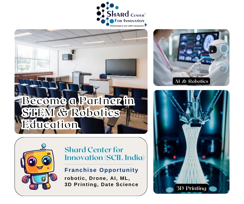 SHARD Center for Innovation Franchise Opportunity — “Become a Partner in STEM & Robotics Education” offers prospective entrepreneurs and investors the chance to join the fast-growing EdTech and STEM education revolution. Build a profitable, scalable, and socially impactful business by offering hands-on learning in AI, Robotics, IoT, 3D Printing, Drones & more under the SHARD brand. Aligned with NEP 2020, CBSE & global STEM curricula Covers AI, ML, Robotics, Drones, IoT, 3D Printing & Design Thinking Full franchise support: curriculum, operations, marketing & training Backed by govt. initiatives & parent demand for STEM learning Scalable & sustainable business model with expansion support Innovate. Educate. Empower — Partner with SHARD to Build the Future.