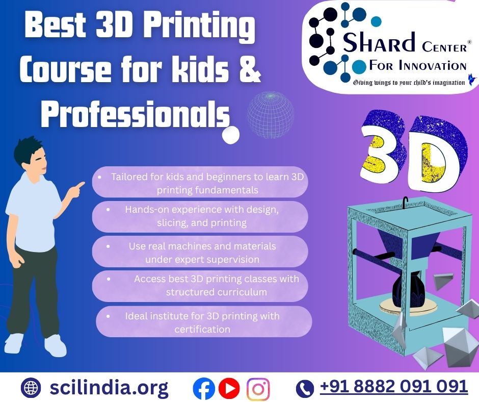Join the best 3D printing course at SCIL, where kids transform ideas into real, tangible creations. This hands-on program teaches design modelling, slicing, material selection, and post-processing using industry-grade printers. As a leading institute for 3D printing, we guide you through each step with expert mentors to ensure strong foundational skills. Learners of all ages focus on creativity, problem-solving, and real-world applications at best 3D printing classes. Whether for personal projects or future careers, this course offers a path to innovation and growth.
