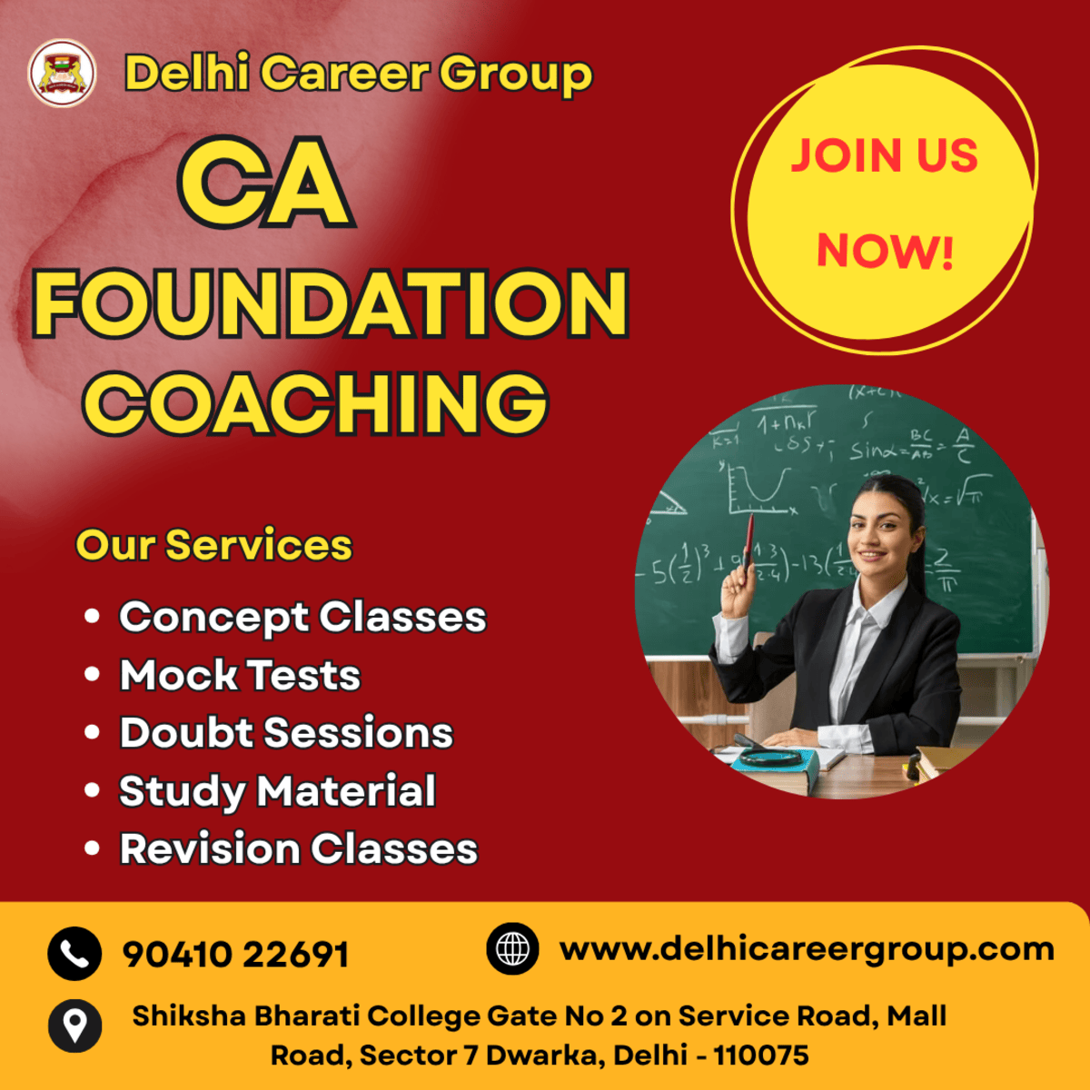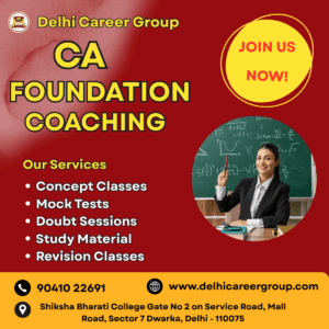 Delhi Career Group offers CA Foundation Coaching in Dwarka, Delhi, designed to help aspiring chartered accountants build a strong foundation for their professional journey. Our program focuses on clear concepts, exam-oriented strategies, and practical problem-solving to boost confidence and performance in the CA Foundation exams. Contact Us: +91 90410 22691 Email Id: info@delhicareergroup.com Location: Shiksha Bharati College Gate No 2 on Service Road, Mall Road, Sector 7 Dwarka, Delhi – 110075