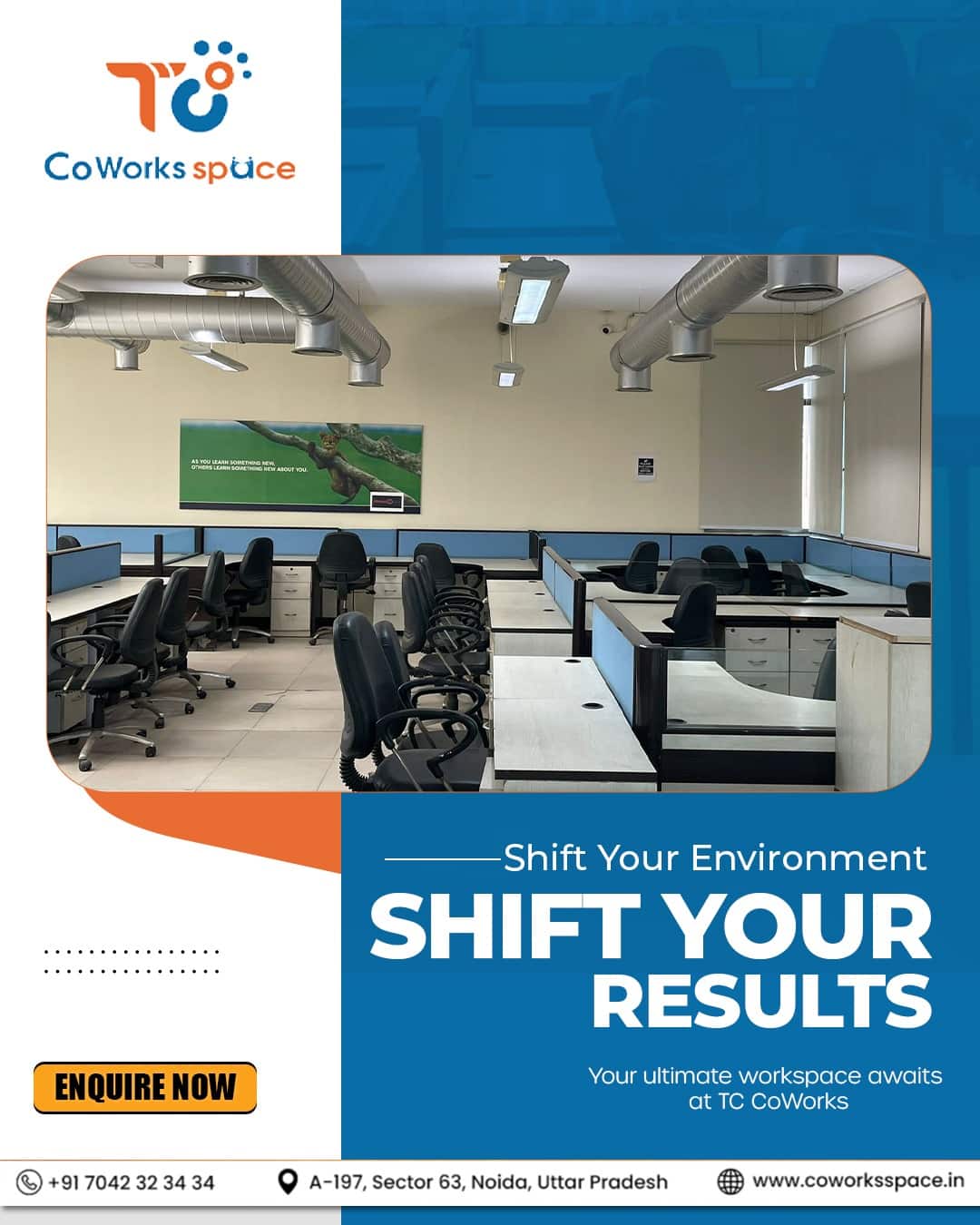 Are you looking for cowork space in Noida Sector 63? TC CoWorks Space is an upscale fully equipped workspaces that are available to startups, freelancers, and expanding businesses. Having fast internet access, personal cabins, meeting rooms, special desks and an energetic community, we are offering the best environment to be productive. TC CoWorks Space is situated in the best of regions of Noida, with high quality facilities, pay-as-you-need, and professional ambiance to help your business thrive. We are the best place to get the quality coworking experience that suits your needs. Call us on +91 7042323434 Address: Ground Floor, A – 197, A Block, Sector 63, Noida, Uttar Pradesh 201309