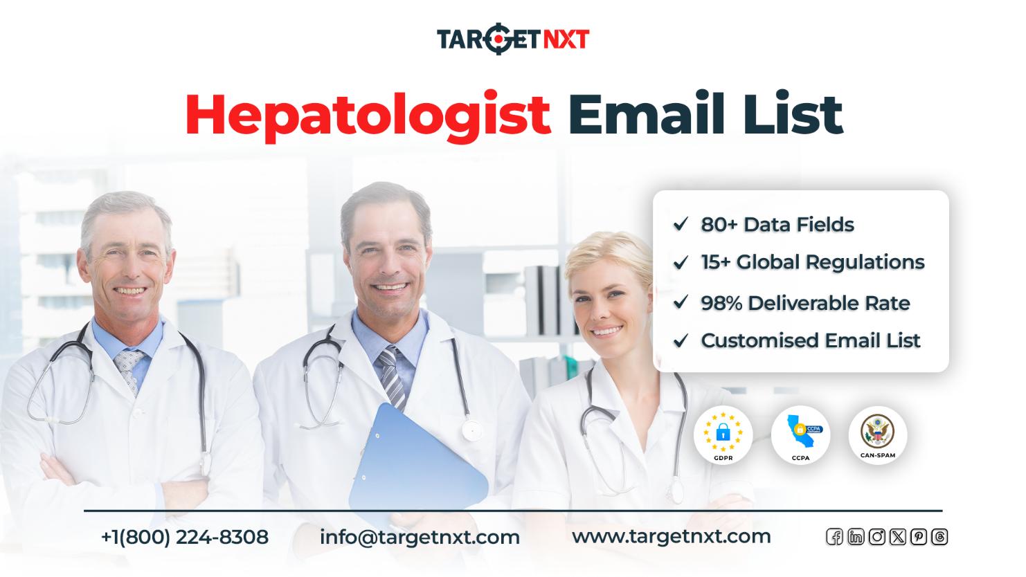 Rely on TargetNXT’s Hepatologists Email List i.e., built properly by conducting an in-depth analysis of your target audience to ensure you get the most out of it. By choosing our email list, you are actually making a lifetime investment in a database that caters to client prospecting and business. So what’s the delay? Procure our customizable email list and ace your campaigning game.