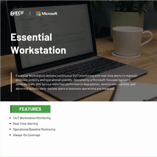 ECF Data LLC delivers secure, Microsoft-focused managed IT services through its Essential Workstation plan, offering 24/7 workstation monitoring with real-time alerts and operational baseline tracking. Designed for businesses, government contractors, and compliance-driven organizations, this service helps detect performance issues early, reduce downtime risk, and maintain endpoint visibility across remote and on-site teams. Backed by expertise in Microsoft 365, Azure, GCC High, and regulatory standards like CMMC and NIST, ECF Data provides dependable, security-first oversight. Features: • 24/7 workstation monitoring with continuous performance and health tracking • Real-time alerting based on defined thresholds and abnormal activity • Operational baseline monitoring to detect deviations early • Always-on coverage, including nights, weekends, and holidays Offers & Benefits: • Early issue identification before user impact • Reduced downtime and operational disruption • Improved IT visibility across distributed teams • Consistent monitoring for on-site, remote, and hybrid environments Why ECF Data: ECF Data LLC is a Microsoft-focused Managed Services Provider supporting Microsoft 365, Azure, and GCC High environments. With experience in regulated industries and compliance frameworks such as CMMC and NIST, their team delivers structured, security-first monitoring aligned with modern operational standards. Learn More: Visit: https://store.ecfdata.com/products/essential-workstation