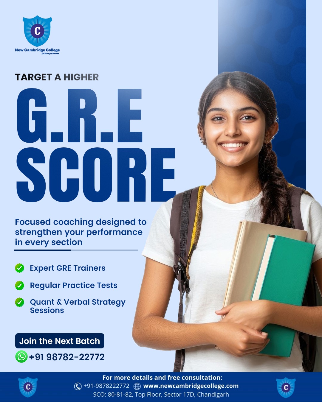 Join professional GRE coaching Chandigarh at New Cambridge College and prepare confidently for the Graduate Record Examination. Our GRE program includes expert faculty guidance, detailed concept explanations, strategic test-taking techniques, and regular mock exams. With focused training and individual support, students can strengthen their fundamentals and improve their overall GRE performance.