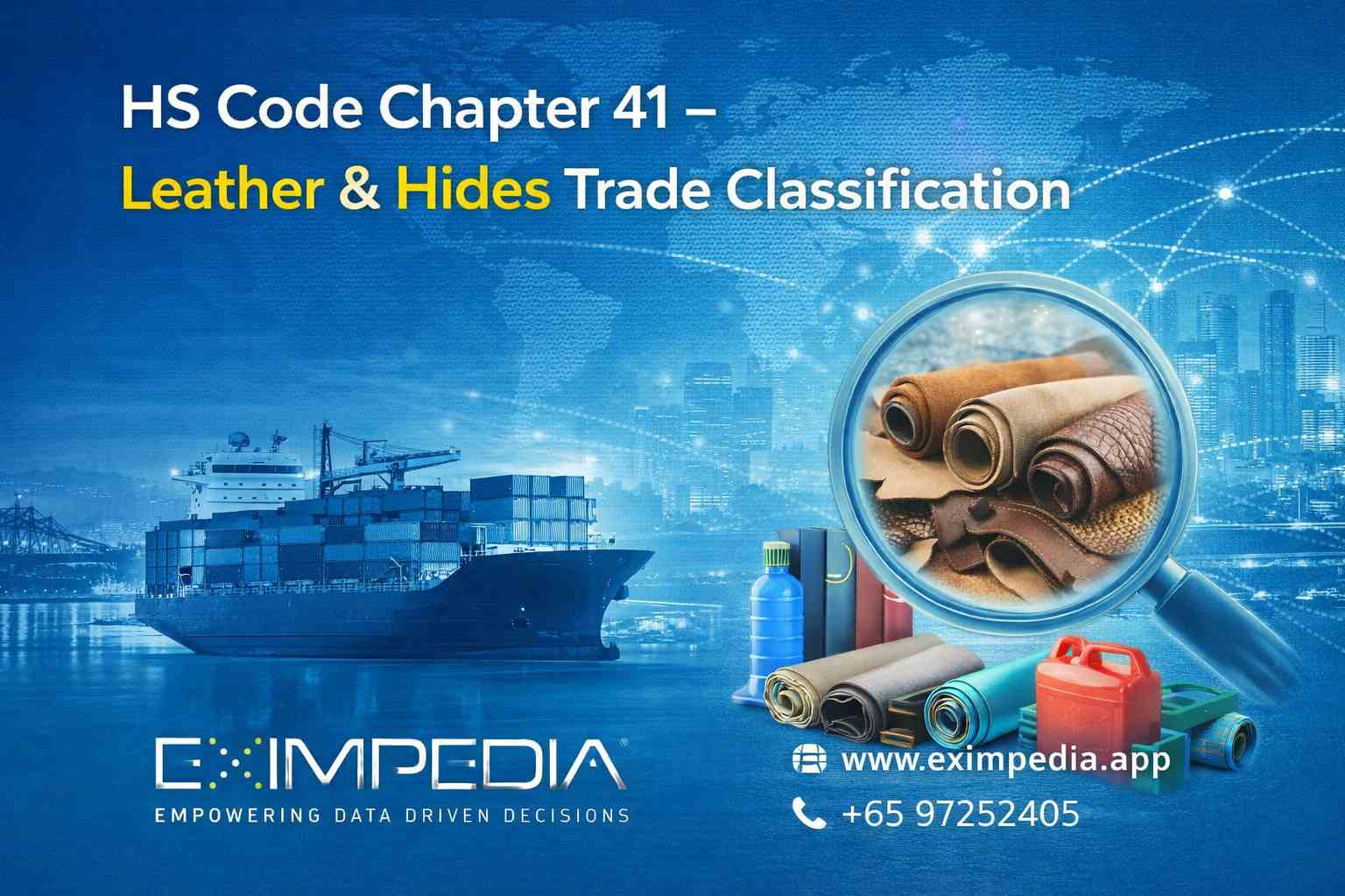 HS Code Chapter 41 helps businesses classify leather and hide products accurately for import-export compliance. Access shipment records and trade analytics connected to HS Code Chapter 41 with Eximpedia. To Learn more request a free demo today.