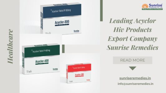 Human Immunodeficiency Virus attacks the immune system, weakening the body’s natural defense against infections. Antiretroviral therapy remains the primary treatment approach to suppress viral replication and maintain immune health. In some cases, antiviral medicines such as acyclovir-based formulations are also used to manage opportunistic viral infections that may occur in immunocompromised individuals. Supportive antiviral treatment helps reduce complications caused by secondary infections and improves overall patient health outcomes. Choosing a reliable Acyclor HIV Products Exporter ensures that healthcare providers receive safe, effective, and quality-assured pharmaceutical formulations. About Acyclor HIV Products Acyclor products are formulated to provide antiviral support in patients who require additional viral management alongside their primary HIV therapy. These formulations are manufactured with strict quality control to maintain purity, potency, and stability. The effectiveness of antiviral medicines depends significantly on manufacturing precision. Any compromise in formulation standards can affect treatment results. Sunrise Remedies Pvt Ltd ensures that Acyclor products are developed in controlled environments with advanced production technologies and rigorous testing procedures.