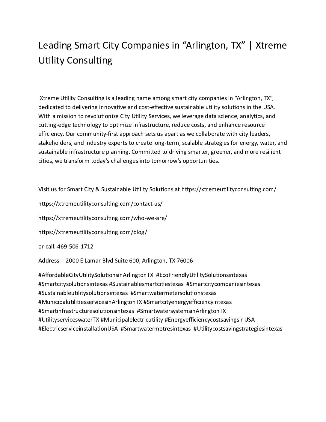 Xtreme Utility Consulting is a leading name among smart city companies in “Arlington, TX”, dedicated to delivering innovative and cost-effective sustainable utility solutions in the USA. With a mission to revolutionize City Utility Services, we leverage data science, analytics, and cutting-edge technology to optimize infrastructure, reduce costs, and enhance resource efficiency. Our community-first approach sets us apart as we collaborate with city leaders, stakeholders, and industry experts to create long-term, scalable strategies for energy, water, and sustainable infrastructure planning. Committed to driving smarter, greener, and more resilient cities, we transform today’s challenges into tomorrow’s opportunities.