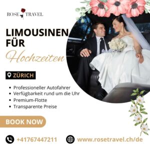 Eine Hochzeitsfeier verdient einen Transport, der ruhig, elegant und perfekt abgestimmt ist. Rose Travel bietet luxuriöse Hochzeitslimousinen in Zürich mit makellos gepflegten Fahrzeugen, aufmerksamen Chauffeuren und reibungsloser Organisation. Kommen Sie entspannt und selbstbewusst an einem Tag an, der von besonderer Bedeutung ist. Buchen Sie noch heute ein rundum gelungenes Hochzeitserlebnis.