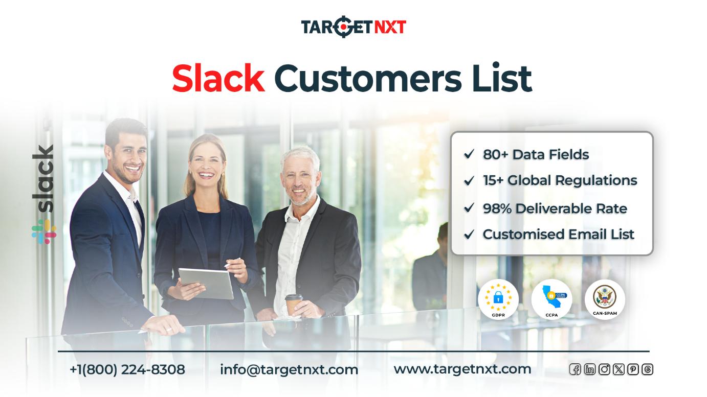 Want to engage businesses and teams using Slack for communication and collaboration? With TargetNXT’s Slack Customers List, you gain access to verified contacts using Slack for team messaging and productivity. Market integrations, apps, or collaboration tools directly to Slack users for higher response rates.