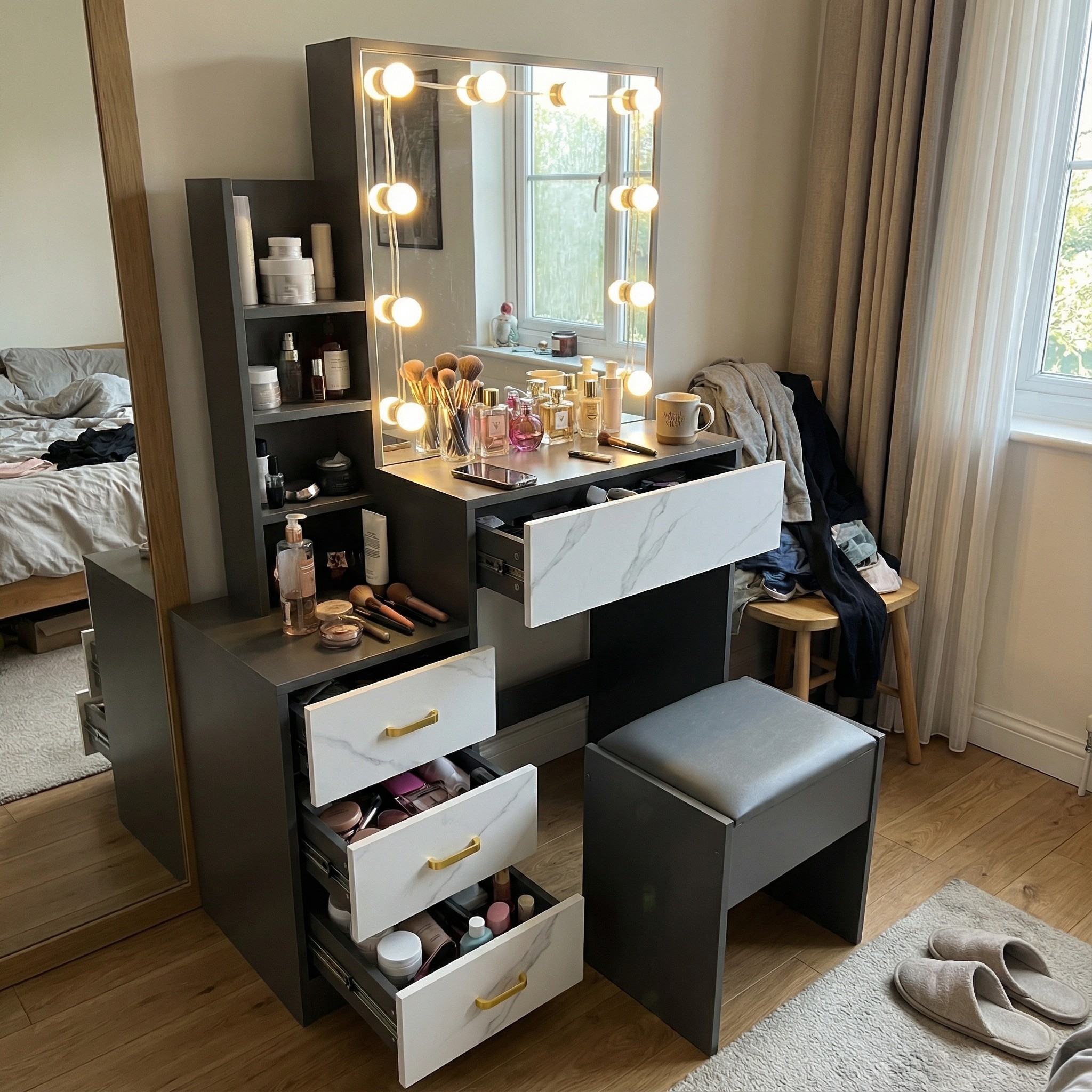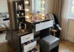 Get the ultimate vanity experience with the Makeup Vanity Desk. It features adjustable lighting for the perfect glow and a mirror that opens to reveal hidden shelves for all your beauty essentials. Say goodbye to clutter and hello to a luxurious grooming space with Dream Home Store’s dressing Table!