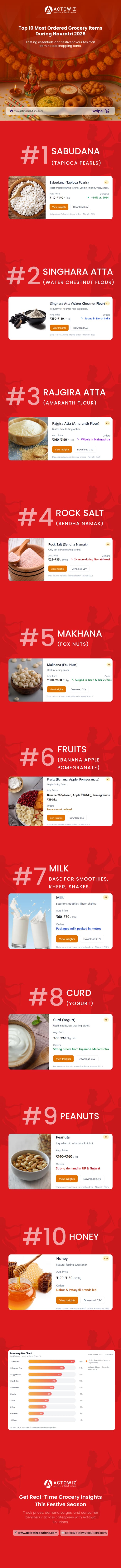 Discover the top 10 most ordered grocery items during Navratri 2025. Explore popular festive essentials for fasting, cooking, and celebrations.