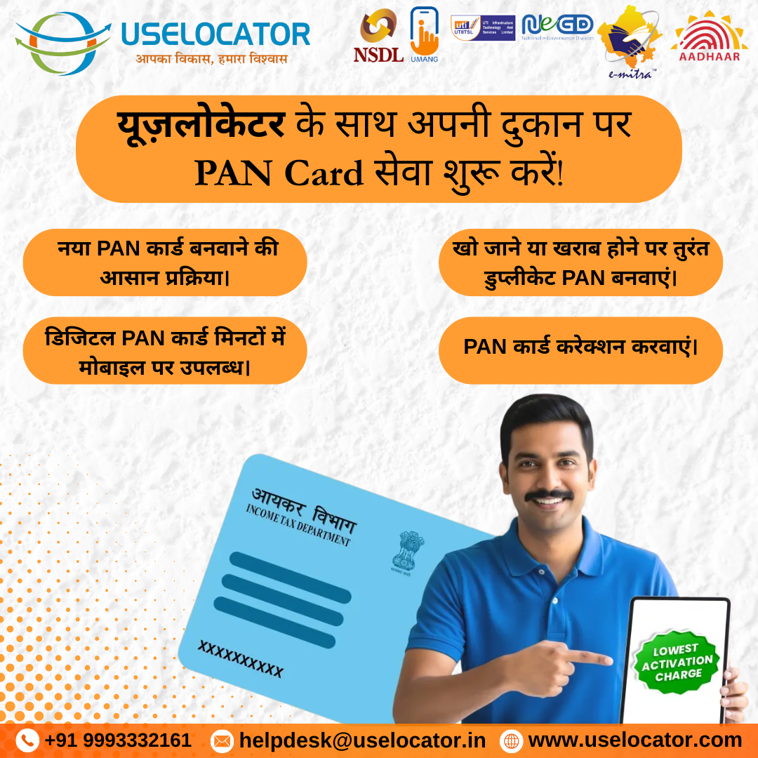 “Get easy and secure PAN Card services with Uselocator. Apply for a new PAN Card, get a duplicate for lost or damaged cards, download digital e-PAN instantly, or make corrections to your existing PAN details. Available these services from your shop or home in just a few minutes.
